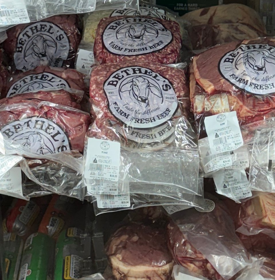 Variety of Steaks (Rib Fillet, Rump, Crumb Steak, BBQ Steak, T-Bone, Y-Bone & Eye Fillet), Roast (Rolled or Blade), Corned Meat (Silverside or Brisket), Osso Bucca & Diced Meat, Rib & Soup Bones, Mince and Sausages. Additional products available on request: Diced or Strip Meat. Offal (Beef Cheeks, Heart, Kidney’s, Liver, Ox Tail and Tongue). Dog Bones at $5/kg.